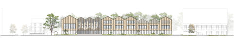 Les politiques publiques menées actuellement sur l’île conjuguent sobriété et innovation pour allier développement urbain et préservation du patrimoine naturel remarquable en présence. L’Île s’affirme comme « ville verte et bleue » en Ile-de-France. Parallèlement, les habitants de la commune peuvent aussi compter sur une politique d’humanité et d’apaisement, favorisant le vivre- ensemble et valorisant le cadre de vie. Notre parti pris architectural se veut suffisamment éloquent pour acter durablement le renouveau du groupe scolaire Paul Langevin. L’idée est de l’inscrire dans une nouvelle modernité par un « sursaut » esthétique, voire philosophique. Rompre avec l’architecture générique actuelle, passe selon nous par une architecture contextuelle et inspirée des milieux qui l’accueille. L’expressivité́ du projet s’inscrit d’abord en résonnance avec la volumétrie des habitations voisines pour faire sens à l’échelle du quartier. Plus conceptuellement, l’architecture du futur groupe scolaire emprunte ses lignes au langage architectural de la « cabane », ce refuge que les enfants chérissent tant, et qui appartient indéniablement au paysage fluvial (barge habitée, cabane de pécheur, petite maison éclusière, entrepôts, etc.). Afin de répondre aux contraintes de la réhabilitation/ extension, cet imaginaire se décline différemment sur les deux volumes qui composent le projet. En effet, l’extension trouve son dessin dans un rapport intime avec le ciel. Cette répétition de toitures deux pans forme une silhouette singulière perceptible à l’échelle de la ville. A contrario, le bâtiment Pailleron réhabilité décline cet imaginaire dans son rapport au sol par le travail archétypal de ces locaux en rez-de-chaussée, des pièces à l’échelle de l’enfant. La subtile ondulation du bardage bois, commune aux deux bâtiments, finie d’écrire cette romance/retrouvaille entre le groupe scolaire Paul Langevin et son paysage. Celle-ci octroyant à la fenêtre une vibration semblable à celle des flots au contact du rivages ou des péniches. Par là, la construction neuve et le « déjà-là » dialogue harmonieusement et portent une seule et même ambition : voir s’établir en ces lieux une « école insulaire » au cœur d’un paysage fluvial.