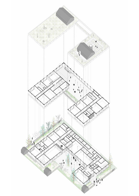 HQE avec Certification / Coefficient biodiversité positif - 100% des toitures végétalisées (végétalisation intensive) / Isolants 100% biosourcés - Schéma structurel résilient - Observatoire de la forêt et jardin d'éveil à la biodoversité