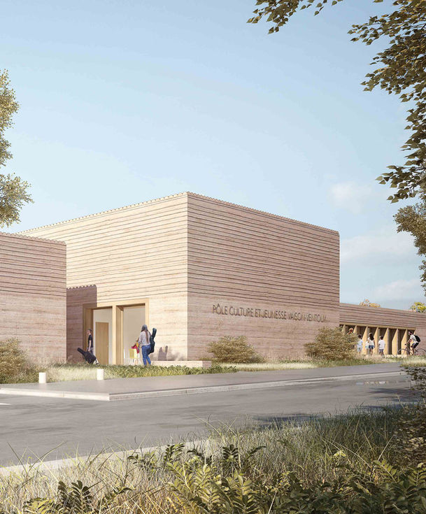La commune de Vaison-La-Romaine s’établit au sud de l’Enclave des Papes entre les Préalpes et la Grande Bleue. En parfaite symphonie, les odeurs, les couleurs, les lumières, les gens du coin, fabriquent l’identité de ce terroir que nous aimons tant. Véritable livre d’histoire à ciel ouvert, Vaison-La- Romaine donne à voir quasi simultanément les époques antique, médiévale et moderne, Comme s’il était possible d’embrasser deux mille ans d’histoire d’un seul coup d’œil. La commune voit ses quartiers ponctués ici et là de « fragments d’Histoire », solidement érigés ou à l’état de vestige. Le projet se veut être l’un de ses fragments de culture, contemporain cette fois. Le projet se distingue par sa « force tranquille », son empreinte carbone maîtrisée, son caractère tellurique, ses ambiances uniques. Incontestablement, nous devons tout cela à sa matérialité : le « béton de site ». Vue comme un outil d’intégration, cette matière in-situ finie d’ancrer le projet dans son contexte local. L’inspiration de cette minéralité nous évoque les vieux bétons artisanaux, et l’épaisse texture des murs de mas battus par le mistral au cœur des paysages viticoles. Le « fait main », l’irrégularité rend la paroi sensible, voire poétique. Le Pôle Culturel trouve véritablement son expressivité dans la vérité de sa mise en œuvre et des savoir-faire artisanaux locaux, jusqu’au traitement du couronnement des façades en génoise. Cette silhouette ciselée du futur Pôle Culture et Jeunesse, volontairement apaisée et silencieuse, cherche subtilement à laisser place à l’expression artistique qu’elle accueille en son sein.